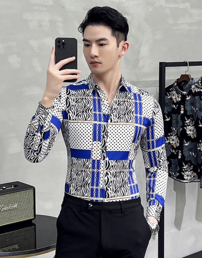 Style:Men’s 3D Print Lapel Neck Long Sleeves Slim Casual Button Shirt Multi-color Tops