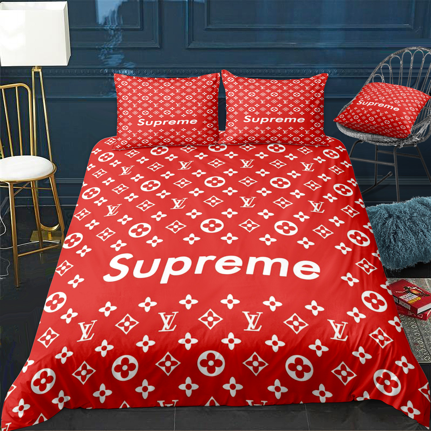 Luxury Louis Vuitton x Supreme Red Monogram Print Bedding Set