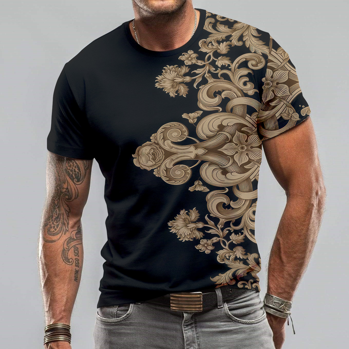 Quarter-turned body to eliminate the center crease. The design is printed with new age printing technology, direct to garment. It is printed with a water – soluble and eco – friendly ink.